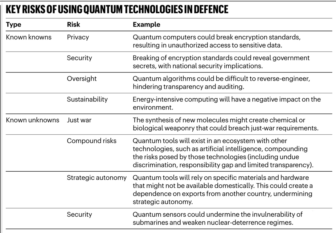 “However, as well as promises, these uses come with ethical risks (see ‘Key risks of using quantum technologies in defence’). For example, powerful quantum computers could enable the creation of new molecules and forms of chemical or biological weapons. They might break cryptographic measures that underpin secure online communications, with catastrophic consequences for digitally based societies. Quantum sensors could be used to enhance surveillance, breaching rights to privacy, anonymity and freedom of communication.”