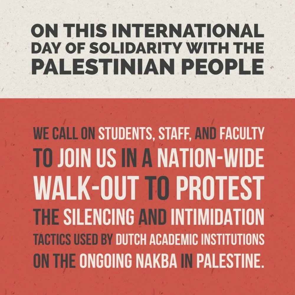 Dutch Scholars for Palestine (DSP) has many concerns about the role of Dutch universities in relation to the ongoing atrocities committed in Palestine. On November 29th, the International Day of Solidarity with the Palestinian People, join us from 12:00 to 13:00 for a National Walkout!