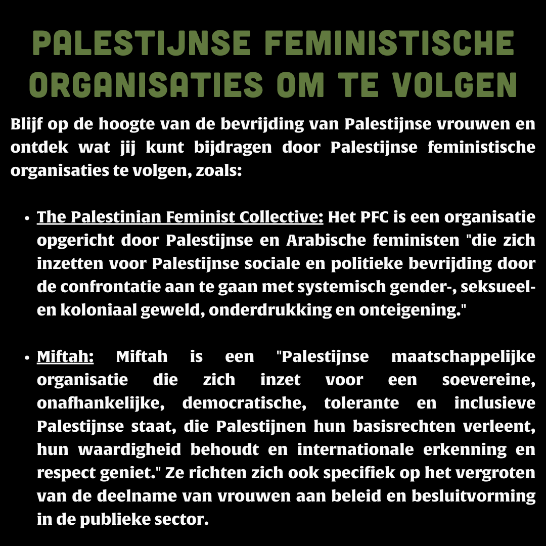 We moeten druk blijven uitoefenen op Israël en zijn aanhangers en financiers. Eén manier om dat te doen is door boycotcampagnes op te zetten. Daarom roepen we iedereen die werkt in de academische en/of culturele sector op om zich aan te sluiten bij de Palestijnse Campagne voor de Academische en Culturele Boycot van Israël (PACBI). Je kunt meer over deze campagne lezen op de webpagina van PACBI, die ook te vinden is in onze bio. We moedigen iedereen ook aan om BDS (Boycot, Desinvestering en Sancties) in hun dagelijks leven toe te passen, bijvoorbeeld door geen Israëlische dadels te kopen.